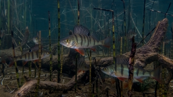 Täysosumakuva ahvenparvesta. Järvikortetausta on fantastinen! Valo on hallittu, mikään kaloista ei ole ylivalottunut, mikä tapahtuu helposti. Pääkohde keskellä ottaa katsekontaktia ja pörhistelee kuvaajalle. Kuvassa on fiilis, että katsoja voisi uida osana parvea, snorklaajan unelma. Sommittelu on osunut kohdalleen. Valloittava kuva. - Valon lapsi. Ari Linna